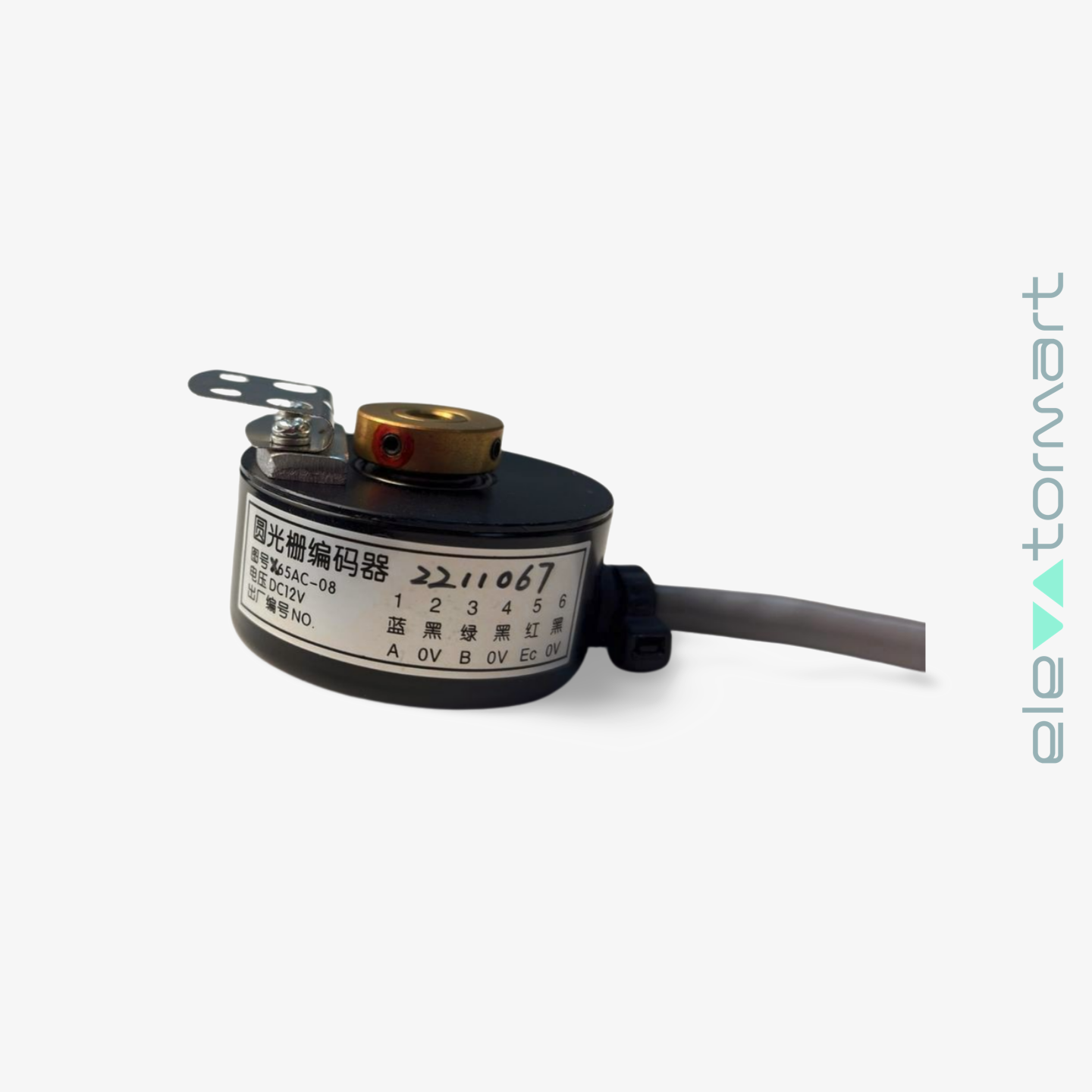 A rotary encoder is an electromechanical device that converts the angular position or motion of a shaft into digital or analog signals. They are used in elevators to measure rotational speed and direction.